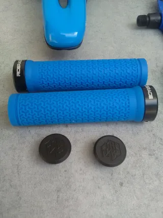 artículo nuevo a estrenar. deja tu bicicleta super guapa con este juego que te ofrezco. se compone de lo siguiente: - puños RIDERACE con abrazadera y logotipo de la marca en el tapón - pedales LEBICLE de plataforma don pines intercambiables. - sillín de gel WEST BIKING bicolor negro y azul con canal antiprostatico. más artículos en mi perfil. taller resucitabicis.