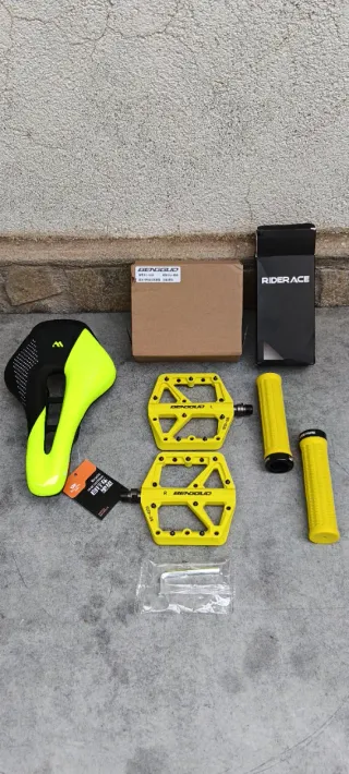 artículo nuevo a estrenar. deja guapa la bicicleta con este juego que te ofrezco. se compone de lo siguiente: - sillín de gel West Biking bicolor en negro/amarillo con canal antiprostatico. - puños de goma RIDERACE con abrazadera. - pedales BENGGUD BG-4220 de plataforma con pines intercambiables. más artículos en mi perfil. taller resucitabicis.