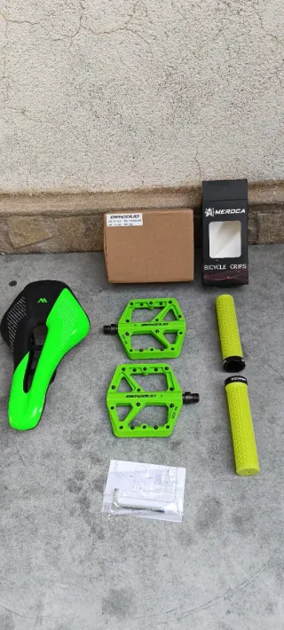 artículo nuevo a estrenar. deja guapa tu bicicleta con este juego que te ofrezco. se compone de lo siguiente: - sillín de gel West Biking bicolor en negro/verde con canal antiprostatico. - puños de goma MEROCA con abrazaderas. - pedales BENGGUD BJ-4220 de plataforma con pines intercambiables. más artículos en mi perfil. taller resucitabicis.