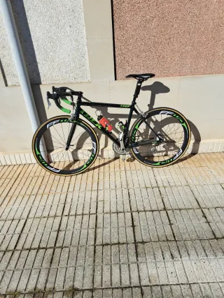 Bicicleta de carretera verde oscuro metalizado talla 54 - Cuadro de aluminio con horquilla, tirantes traseros, tija de sillín, potencia y manillar de carbono - Ruedas de carbono perfil 50 con tubulares nuevos Victoria Strada Montada en Campanolo Veloce y desviador delantero Shimano 105 Catalinas compacto Shimano con pedales automáticos shimano Frenos Ultegra - Incluye portabidónes élite nuevos a estrenar Sillín Selle Italia gel Flow antiprostatico a estrenar Cinta de manillar nueva a estrenar Soporte Garmin