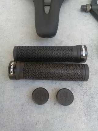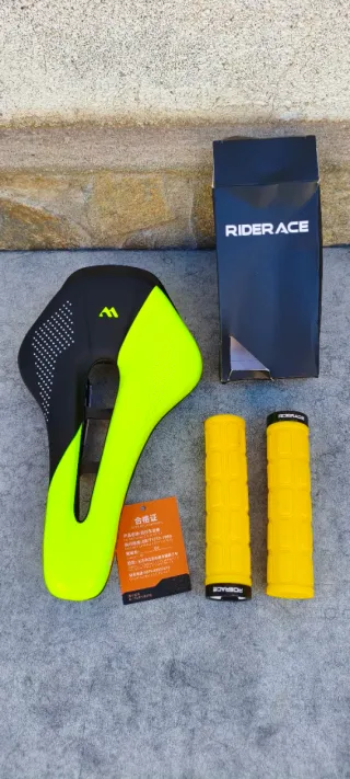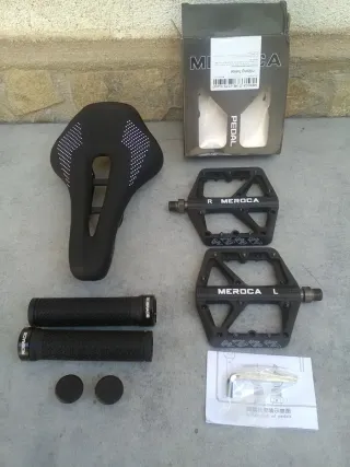 artículo nuevo a estrenar. juego de ciclismo en oferta. viene con lo siguiente: - sillín de gel West Biking con canal antiprostatico. - pedales de plataforma MEROCA con pines intercambiables. - puños de goma RIDERACE con abrazadera y tapones con el logotipo de la marca. más artículos en mi perfil. taller resucitabicis.