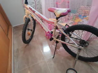 Bicicleta infantil de color rosa, ideal para niñas. - Incluye casco protector a juego. - Ruedines para aprendizaje. - Sillín y manillar ajustables. [El patín viene incluido en el precio]