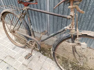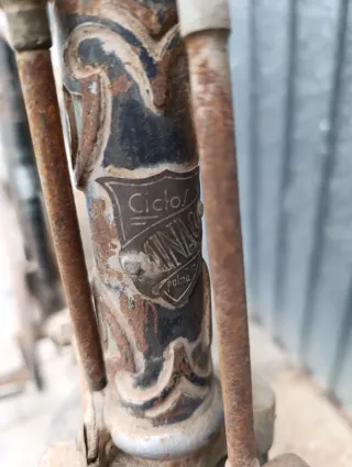 Bicicleta clásica Minaco de palma de mallorca con sistema de frenos de varillas. Para restaurar. - Cuadro acero con guardabarros con patina original - Ruedas de radios de 650B - Sillín con muelles. - Lleva en el manillar cepo portaobjetos y transportin trasero. - Lleva la chapa de la marca original el la parte frontal Si se recoge en mano, 60€. Si se envía, 80€