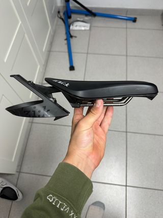 Sillín desmontado de una Canyon speedmax nueva - Fizik Transiro Aeris R1 de railes de carbono,diseñado para largas distancias y rendimiento aerodinámico. - Color negro mate. - Diseño ergonómico. - Logotipo de Fizik en blanco.
