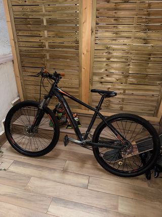 Bicicleta de montaña Orbea con un diseño llamativo en negro y detalles naranjas. - Cuadro de aluminio. - Ruedas de 29 pulgadas. - Frenos de disco. - Suspensión delantera. La rueda trasera está recién cambiada entera. Mangos, frenos y sillín desgastados, habría que cambiarlos. La vendo porque me compré un patín eléctrico y ya no la uso