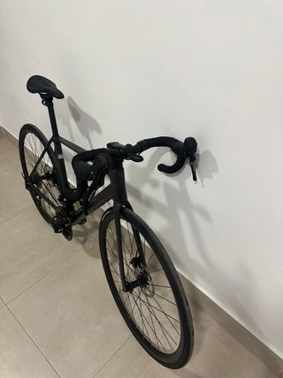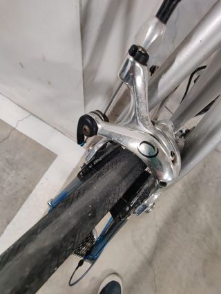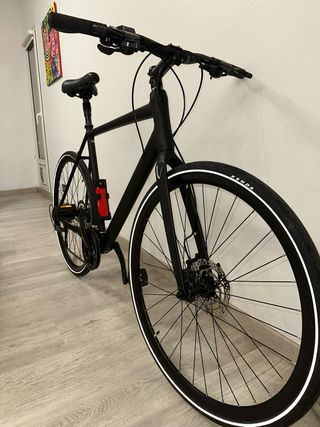 Color negro mate. Muy cómoda gracias a la posición del manillar,puños ergonómicos y amortiguador en el sillín. Perfecta para desplazamientos por ciudad o rutas por asfalto. Es una auténtica maravilla. -Cubiertas originales en perfectas condiciones -Sillin original con amortiguador - Cuadro de aluminio. -Horquilla de carbono - Frenos de disco. - Ruedas de 700c con banda reflectante. - Transmisión Shimano. 3 platos y 8 piñones -Ninguna marca que destacar. Solo las típicas del uso. -Recién revisada y lista para disfrutar de nuevas rutas. -Mejor verla Precio no negociable . #bizipaseo#ciudad#gravel#bikepaking#sensero#