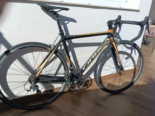 Bicicleta de carretera Orbea de carbono con detalles en naranja. - Cuadro y horquilla de carbono - Manillar y potencia Orbea. - Ruedas Orbea. - Sillín Orbea. - Cambio Shimano ultegra .