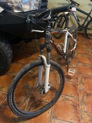 Bicicleta de montaña Orbea. - Cuadro blanco con detalles naranjas y azules. - Horquilla delantera Bomber. - Ruedas Continental Trail King. - Sillín negro con bolsa. - Portabidón blanco.