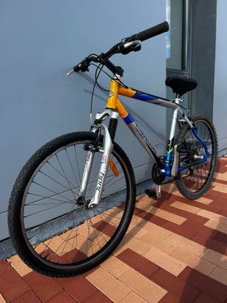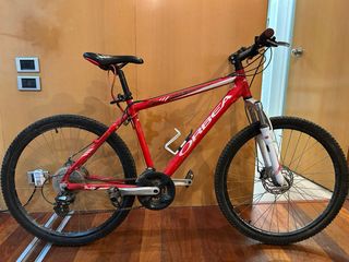 Bicicleta de montaña de la marca Orbea en buen estado y funcionando perfectamente. Ideal para paseos, rutas por montaña, caminos o uso diario. • Cuadro resistente y ligero •Suspensión delantera •Cambio de marchas trasero (varias velocidades) •Ruedas de montaña con buen agarre •Freno de disco delantero •Portabidón incluido •Sillín cómodo y regulable