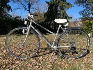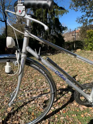 Bicicleta de paseo Orbea en plata, restaurada y lista para disfrutar. Un clásico con un toque renovado. - Cuadro de Orbea. - Sillín blanco. - Guardabarros. - Portaequipajes. Pieza original, revisada y puesta a punto para disfrutarla.