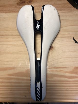 Sillín Specialized Romín SL en blanco, en buen estado. Ancho de 143 mm - Diseño Body Geometry.