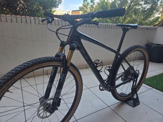 Epic HT SWorks montada a partir de un cuadro SWorks con factura y número de serie. Horquilla Fox 32 Factory Kashima, transmisión grupo completo Sram GX Eagle AXS electrónico 1x12, ruedas custom con aros Duke y bujes Yuniper Nitro (1450g). Tija carbono SWorks y cockpit completo de carbono OnOff Helium. Frenos Sram Level TL. Peso con pedales y dos portabidones 9.5kg, 9kg sin ellos. Margen para bajarle medio kilo sin mucho problema cambiando sillín y bielas. La bici está impecable, el cuadro está protegido con vinilos y se ha usado exclusivamente en pista por un rider de 70kg. Mejor ver en persona. Se vende sin pedales ni portabidones.