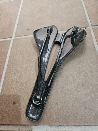 ¿Quieres quitar 100 g a tu bici por poco dinero? Vendo sillín de carbono ultraligero (90–95 g), antiprostático NUEVO. El mismo que usamos yo y algunos de mi grupeta: - Raíles ovalados 7×9 mm - Medidas: 240 × 143 mm - Peso: hasta 120 kg - Estado: NUEVO, tenemos stock por pedido masivo. En 2 días lo tienes Puedes ver fotos reales del sillín y de mi bici con él montado. Venía de un Selle Italia FLITE de 186 gramos y la he aligerado, de golpe y de modo muy económico, más de 90 gramos. Uno de los mejores hacks de siempre. Sillín cómodo pensado para rendimiento y tiradas largas (puedes buscarme en strava con mi nombre)