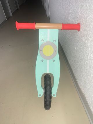 Preciosa bicicleta sin pedales, de Imaginarium, ideal para fomentar el equilibrio en niñ@s de 2 a 4 años. - Diseño vintage que imita una Vespa en color verde menta y detalles en rojo. - Estructura de madera. - Manillar con empuñadura antideslizante (goma) - Ruedas todoterreno fuertes y anchas - Sillín acolchado y regulable a 3 alturas (mínima: 32cm) Está en muy buen estado, se ha usado poco. Tiene algún roce pequeño pero su estructura, eje y ruedas están perfectos, seguridad garantizada. Medidas: 50 x 77 x 32,5 (manillar) cm