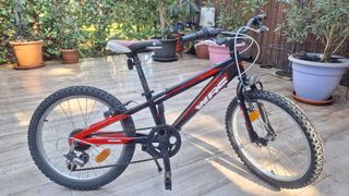 Bicicleta WRC Invader en color negro y rojo. - Cuadro de aluminio. - Ruedas de 20 pulgadas. - Frenos V-Brake. - Sillín ajustable.