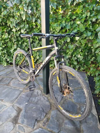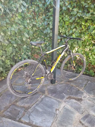 Bicicleta de montaña con un diseño llamativo en negro y detalles amarillos. Cambio shimano 42T. Tres platos 7 coronas. Ruedas 27,5 pulgadas. Talla L. Necesita una limpieza y un ajuste. Incluye portabotellas. Los accesorios que se incluyen en una foto van aparte y son: 2 luces traseras a 2€ cada una 1 portabotellas 2 € una bolsita 4€ una funda para el sillín 5€.
