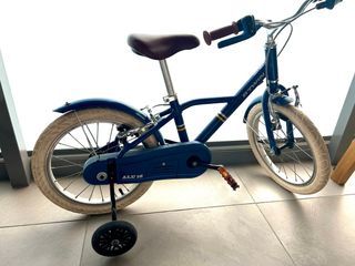 Bicicleta infantil B'TWIN de color azul, modelo ALU 16 (aluminio 16 pulgadas) con algunas marcas por el uso como se puede ver en las fotos. - Ruedines incluidos. - Sillín marrón. - Manillar con puños marrones.