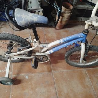Bicicleta de montaña en color blanco con detalles en rojo y azul. - Sillín con funda negra y ribete rojo. - Rueda trasera con piñones. - Pedales negros con detalles amarillos.En buen estado lo único poner recamaras de las ruedas
