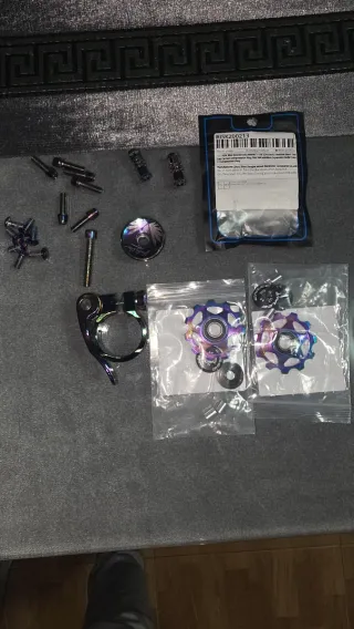 Conjunto de piezas para bicicleta, incluyendo tornillería y roldanas. - Tornillos de titanio de varios tamaños. - Roldanas de cambio de color iridiscente. - Abrazadera de sillín. - Tapa de potencia. Pregunten precio....
