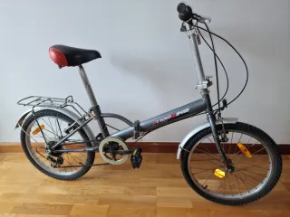 Bicicleta plegable Freebike en color gris. Ideal para desplazamientos urbanos y fácil de almacenar. - Cuadro plegable. - Ruedas de 20 pulgadas. - Portabultos trasero. - Sillín ajustable. Incluye cable de acero para amarre antirrobo.