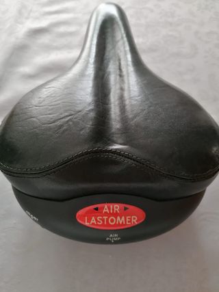 Sillín impecable, muy bueno y poco usado. Parte superior en auténtica piel negra con la amortigiacion de aire. Lo único que hay que hacer es inflarlo manualmente. Apto para bicicletas de ciudad y turismo. Marca Monza de la mejor calidad