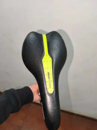 Sillín de bicicleta con diseño ergonómico. - Color negro con detalles en amarillo. - Inscripción ERGOSYSTEM en la parte central.