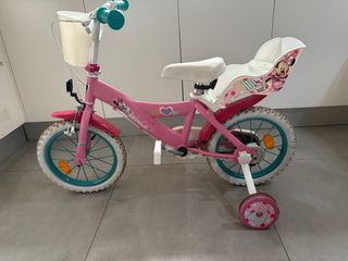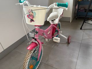 Bicicleta infantil de color rosa con diseño de Minnie.14 pulgadas - Cesta delantera. - Sillín y asiento trasero. - Ruedines de apoyo.