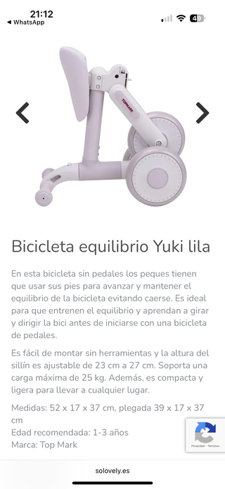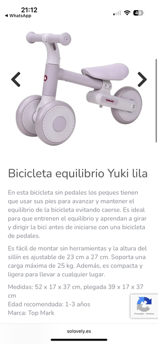 Bicicleta de equilibrio sin pedales, modelo Yuki en color lila de la marca Top Mark. Nunca usada. - Ideal para que los peques aprendan el equilibrio y a dirigir antes de usar una bicicleta con pedales. - Sillín ajustable de 23 cm a 27 cm. - Soporta una carga máxima de 25 kg. - Medidas: 52 x 17 x 37 cm (plegada 39 x 17 x 37 cm). - Edad recomendada: 1-3 años.