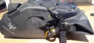 Bolsa de sillín Apidura de 9 litros. Diseñada para ciclistas, ofrece espacio para llevar equipamiento. Precio original 144€ - Capacidad de 9L. - Material resistente y duradero. - Cierre seguro con hebillas. - Logo de Apidura visible.