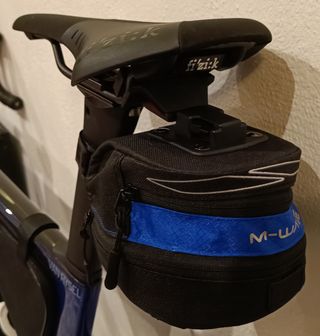 Bolsa con soporte para sillín de bicicleta. Tamaño XL con cremallera adicional para ampliar la capacidad. Banda azul refectante. Liberación rápida con un clic. Nueva.