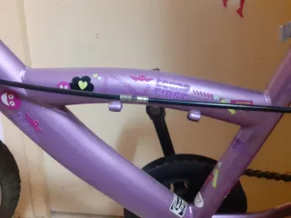 Bicicleta infantil en buen estado, ideal para niñas. - Color blanco con detalles morados. - Ruedas blancas. - Sillín morado con diseño. - Guardabarros morado.