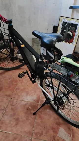 Bicicleta eléctrica Rockrider en color negro. Ideal para tus desplazamientos. -Cambio Shimano nuevo -Mando cambio Shimano nuevo -Cable y funda -Cadena nueva -Piñones nuevos -Pata de estacionamiento - Cuadro robusto. - Ruedas todoterreno. - Sillín cómodo. - Portaequipajes trasero.