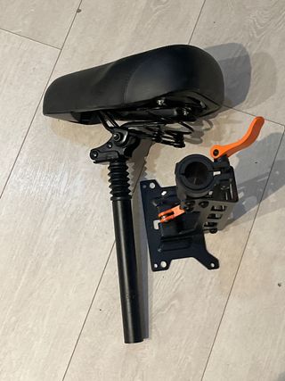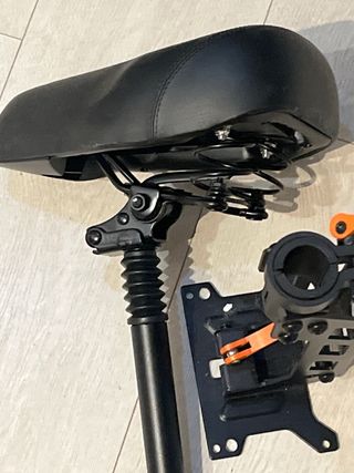 Sillín nuevo para patinete Kukirin. Incluye el sillín, el poste y el mecanismo de sujeción. - Sillín negro acolchado. - Poste de metal negro con amortiguación. - Mecanismo de sujeción con palanca naranja.