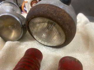 Conjunto de piezas para bicicletas antiguas, ideal para restauraciones o proyectos. - Faro delantero metálico. - Faro trasero rojo. - Dinamo. - Reflectante rojo. - Sillín de cuero. - Puños rojos. - Varias piezas de sujeción y varillas.