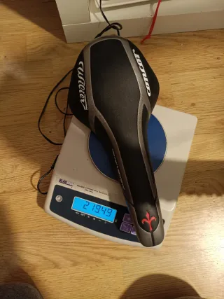 Sillín de bicicleta San Marco Concor para Wilier Triestina. Se encuentra sobre una báscula digital que marca 219.49 gramos. - Marca: San Marco Concor - Modelo: Wilier Triestina - Peso: 219.49 g