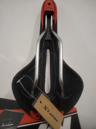 Sillín para bicicleta de montaña S'tarbk con diseño deportivo. - Color negro y rojo. - Detalles plateados. - Marca S'tarbk. Bicicleta de montaña,MTB,fat bike,etc. - NUEVOS A ESTRENAR. - EN STOCK. - HACEMOS ENVÍOS.