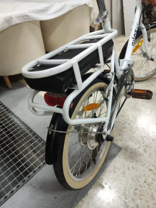 Bicicleta eléctrica Nilox de paseo, ideal para desplazamientos urbanos.NO LE FUNCIONA LA BATERIA. - Color blanco. - Cesta delantera marrón. - Portabultos trasero blanco. - Sillín marrón.