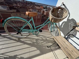 Bicicleta de paseo en color celeste verde menta, talla mediana. Ideal para disfrutar de paseos cómodos. - Cesta de mimbre delantera. - Sillín de cuero marrón. - Guardabarros delantero y trasero. Se puede ver en dos hermanas, sevilla