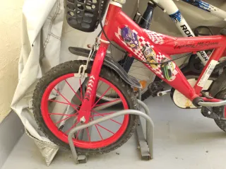 Bicicleta infantil de color rojo, ideal para los más pequeños. Incluye accesorios para mayor comodidad y seguridad. - Diseño inspirado en Lightning Rayo McQueen. - Pata de cabra incluida. - Sillín ajustable. - Cesta delantera. - Timbre.