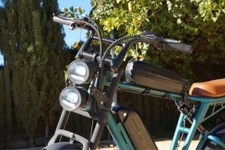 Bicicleta eléctrica con un diseño moderno y llantas anchas. - Color verde vibrante. - Llantas de gran tamaño para todo terreno. - Sillín marrón de estilo retro. - Doble faro delantero. - Batería extraíble. - Guardabarros delantero y trasero. Precio negociable