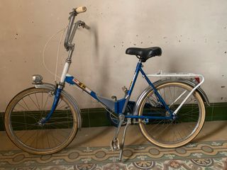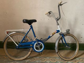 Bicicleta vintage comprada en los años 90 y usada 2 veces, se encuentra en PERFECTO ESTADO sin ningún desperfecto. Ruedas de 20" con guardabarros, luz delantera y trasera con dinamo, sillín ajustable, portaequipajes trasero, pata de cabra y plegable por la mitad para ocupar menos espacio. Las partes blancas se ven de color grisaceo por estar guardada en el garaje, pero con un pequeño lavado desaparece. A recoger en Elda - Alicante