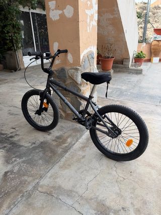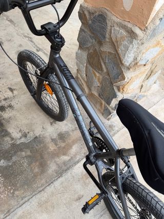 Bicicleta BMX de la marca Wipe, ideal para niños. Su diseño es robusto y está pensada para la diversión. - Color gris oscuro. - Ruedas de 20 pulgadas. - Sillín negro. - Reflectores naranjas en las ruedas.