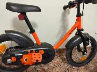 Bicicleta infantil B'TWIN de color naranja con detalles de robots. - Ruedas de 12 pulgadas. - Guardabarros delantero y trasero. - Sillín ajustable en altura. - Reflectores en ruedas y pedales.