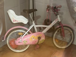 Bicicleta infantil de color rosa, casi nueva y en perfecto estado. - Ruedines incluidos. - Diseño con estrellas y personaje. - Sillín y manillar ajustables.