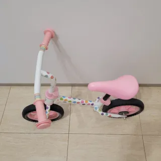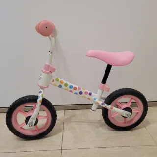 Bicicleta de aprendizaje sin pedales, ideal para los primeros pasos en el mundo de las dos ruedas. Muy poco usada. - Diseño blanco con lunares de colores. - Ruedas negras con llantas rosas. - Sillín y puños en color rosa.