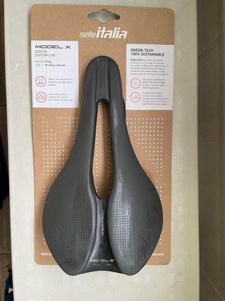 Sillín Selle Italia Model X Green Superflow, diseñado para ofrecer comodidad y sostenibilidad. - Color: Gris - Peso: 315 g. - Dimensiones: 145 mm (ancho) x 245 mm (largo). - Tecnología Green-Tech 100% sostenible, ensamblado sin pegamento. - Acolchado de gel para una mejor absorción de impactos. - Módulo elástico diferenciado para mayor flexibilidad y confort. - Tratamiento antibacteriano en toda la superficie.