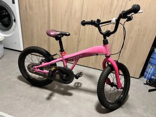 Bicicleta infantil 16pulgadas de color rosa con detalles en azul. Ideal para los más pequeños. - Ruedas blancas. - Sillín blanco. - Guardabarros delanteros y traseros Frenos funcionan perfecto En muy buen estado