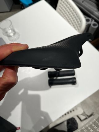 Conjunto de sillín y puños para bicicleta. - Sillín marca Trek Verse. - Puños negros con relieve para mejor agarre. -Sillín con pequeña marca de apoyar el primer día a con la pared.