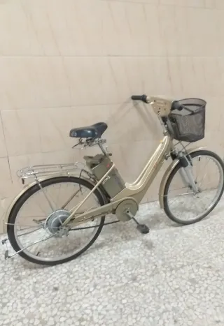 Bicicleta eléctrica DJL en color dorado, con cesta delantera y portabultos trasero. OJO SIN BATERÍA NI CARGADOR. - Diseño moderno y funcional. - Cesta de malla negra. - Sillín negro. - Ruedas de 26 pulgadas.