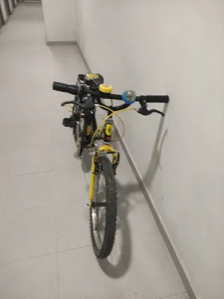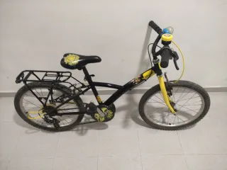 Bicicleta infantil de montaña Decathlon con ruedas de 20 pulgadas. - Color principal negro con detalles en amarillo. - Sillín negro con diseño. - Incluye portabultos trasero.